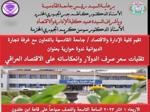 برعاية السيد رئيس جامعة القادسية الأستاذ الدكتور كاظم جبر الجبوري وإشراف السيدة عميد كلية الإدارة والاقتصاد الأستاذ الدكتور سوسن كريم الجبوري عقدت كلية الإدارة والاقتصاد بالتعاون مع غرفة تجارة الديوانية ندوة حوارية بعنوان (تقلبات سعر صرف الدولار وانعكاساته على الاقتصاد العراقي) وحاضر فيها كلٌّ من: